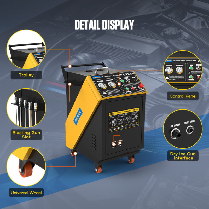 INTELLIGENS MUNKAFOLYAMAT-FELÜGYELETAz AUTOOL HTS709 nemcsak erőteljes, hanem precíz is. A beépített mikroszámítógépes vezérlőrendszernek köszönhetően a kezelő teljes rálátást kap az eszköz paramétereire: Dual Display Manométerek: A kétnyomásmérős rendszer lehetővé teszi a kompresszor felőli bemeneti nyomás és a pisztoly valós üzemi nyomásának egyidejű ellenőrzését. Ez kulcsfontosságú az érzékeny tömítések vagy elektronikai elemek tisztításánál. Fokozatmentes adagolás-szabályozás: A dedikált "Adjustment" gombbal a granulátum mennyisége 0 és 3,2 kg/perc között szabályozható. Ez maximális szárazjég-megtakarítást tesz lehetővé enyhébb szennyeződések esetén. LED állapotjelzők: Jelzik a készülék üzemkész állapotát és a szórórendszer tápellátásának megfelelőségét. |