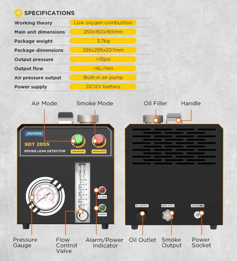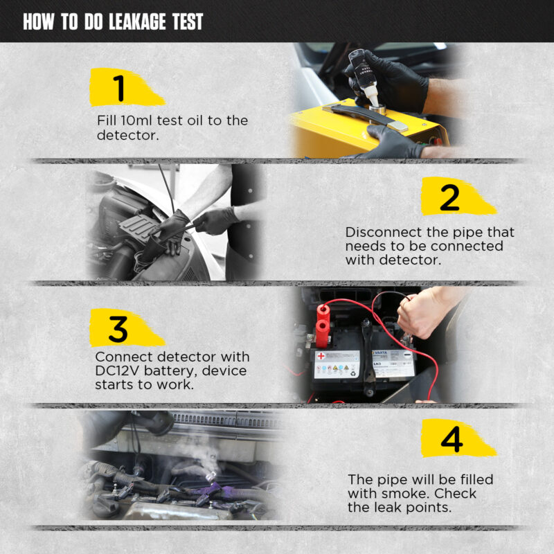 SOKOLDALÚ RENDSZERDIAGNOSZTIKAAz eszköz optimális nyomáson (akár 15 PSI / kb. 1 bar) generálja a füstöt, ami lehetővé teszi a legtöbb személyautó, kisteherautó és motorkerékpár rendszerének biztonságos tesztelését. Fő vizsgálati területek: